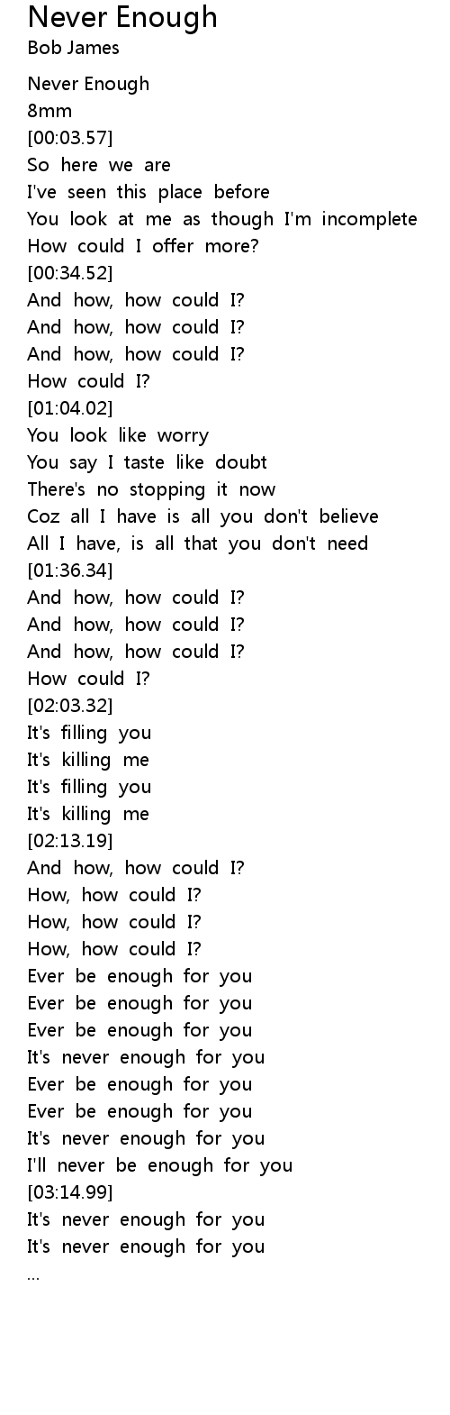 Love Karaoke? Our brand new app is here! Download now for FREE https://singking.link/yt-desc Karaoke sing along of "Never . Never Enough Lyrics are a theme that is being searched for and liked by netizens these days. You can Get the Never Enough Lyrics here. Download all royalty-free pic. Loren Allred - Never Enough (Lyrics), Enjoy!!! This is the lyric video of Never Enough by Loren Allred Hope You Enjoy it :D Weekly Updates Mon : 3 videos Tues : 2 .